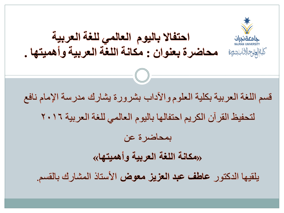 احتفالا باليوم العالمي للغة العربية محاضرة بعنوان مكانة اللغة العربية وأهميتها الاسيت ببليشر