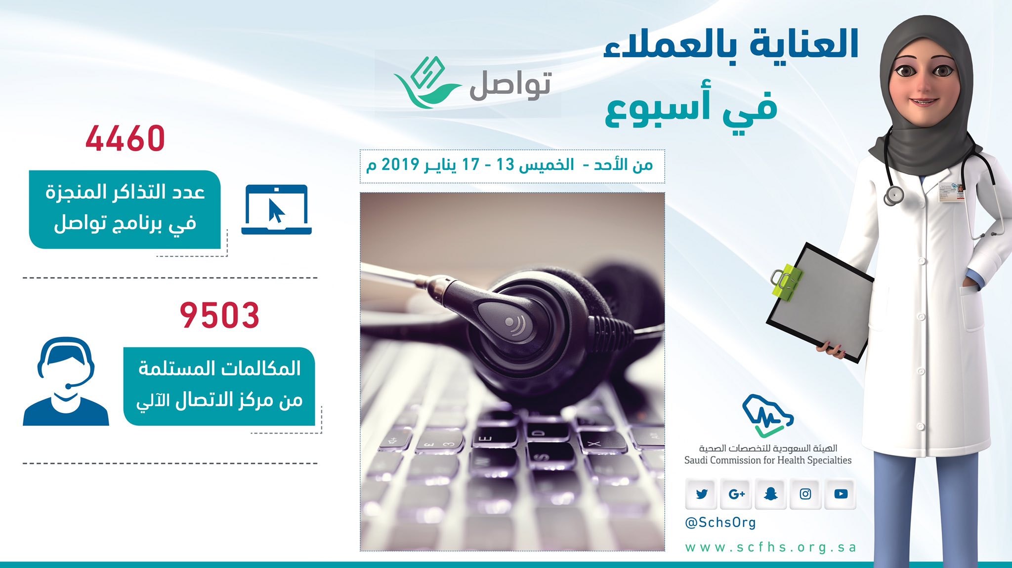 هـ يـ ئـ ة الـ تـ خـ صـ صـ ا ت الـ صـ حـ يـ ة On Twitter التخصصات الصحية انفوجرافيك العناية بالعملاء عدد التذاكر المنجزة في برنامج تواصل 4460 المكالمات